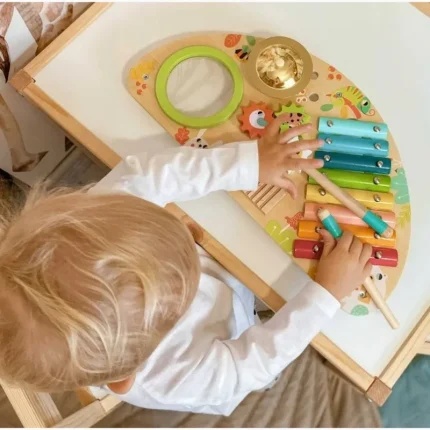 Colorida e cheia de surpresas sonoras, essa mesinha é um convite irresistível para os pequenos explorarem ritmos e melodias desde cedo. Com xilofone, tambor, prato, reco-reco e engrenagens giratórias, ela combina música e movimento de um jeito super divertido. Perfeita para mãos curiosas e ouvidos atentos, transforma qualquer momento em pura descoberta. Uma bancada lúdica feita de madeira para brincar, explorar sons e se encantar com cada toque.