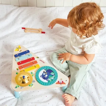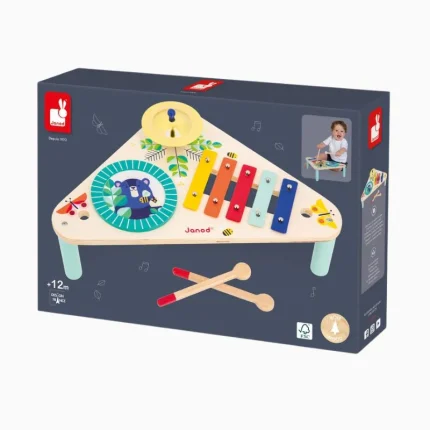 Com cores vibrantes e ilustrações delicadas, esta charmosa mesinha transforma qualquer espaço em palco para descobertas sonoras. Traz três instrumentos – tambor, prato e xilofone de cinco notas – e duas baquetas com compartimento para guardá-las. Cada toque inspira novas aventuras musicais, enquanto estimula a coordenação e a criatividade. Ideal para crianças a partir de 1 ano, é perfeita para brincar, explorar ritmos e se encantar com os primeiros sons da infância.
