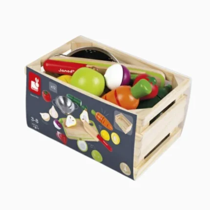 Impossível resistir ao charme desse caixotinho cheio de delícias! Com frutas e legumes coloridos que podem ser cortados de mentirinha, além de acessórios como faquinha, escorredor e tábua, o faz de conta ganha um sabor especial. Tudo feito de madeira com velcro para encaixar e desencaixar quantas vezes quiser. Uma brincadeira envolvente que estimula a criatividade e diverte enquanto imita a rotina da cozinha de forma leve e alegre!