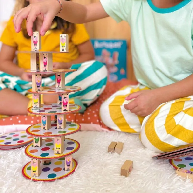A cada nova rodada, o desafio cresce. Os dados determinam onde posicionar as peças, e a torre vai ficando cada vez mais instável. É preciso agir com calma e escolher bem o próximo movimento. Quem derrubar a torre primeiro perde, o que garante risadas e torcida a cada jogada. Um jogo que convida à observação e ao raciocínio de forma leve.