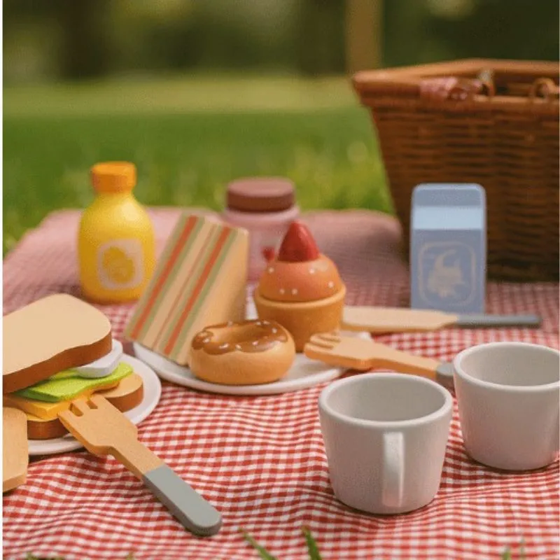 Copinhos, frutas coloridas, toalhinha xadrez e até suquinho de mentirinha: tudo pronto para um piquenique encantador! Este kit transforma qualquer cantinho da casa em um cenário de faz de conta cheio de carinho. Enquanto a criança monta seu lanche e organiza os itens, ela se diverte e exercita a imaginação. Perfeito para brincar com amigos ou adultos, ele desperta o prazer de compartilhar e cria momentos cheios de afeto e fantasia.