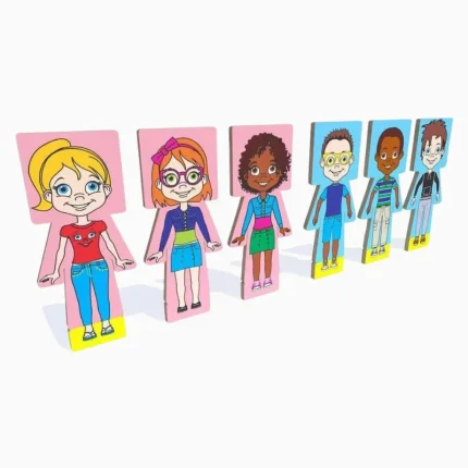 Com peças coloridas e cheias de personalidade, este jogo convida as crianças a montarem personagens únicos misturando roupas, cabelos e expressões. São 72 peças em madeira com recortes que se encaixam em trios, formando combinações divertidas para criar estilos femininos e masculinos. A atividade estimula a coordenação, a imaginação e a interação entre pequenos criadores de moda, tudo acondicionado em uma charmosa caixa de madeira que facilita o transporte e a organização.