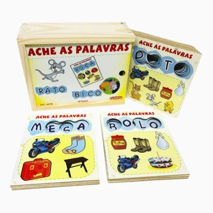 Para os pequenos curiosos das letras, este jogo é um convite irresistível à descoberta das palavras. São 16 plaquinhas de madeira, impressas frente e verso, que desafiam a completar nomes a partir das imagens. Cada peça se encaixa no estojo de madeira que acompanha o conjunto, perfeito para manter tudo organizado. Um passatempo divertido e envolvente, ideal para transformar o momento de aprender em uma brincadeira prazerosa e cheia de significado para a infância.