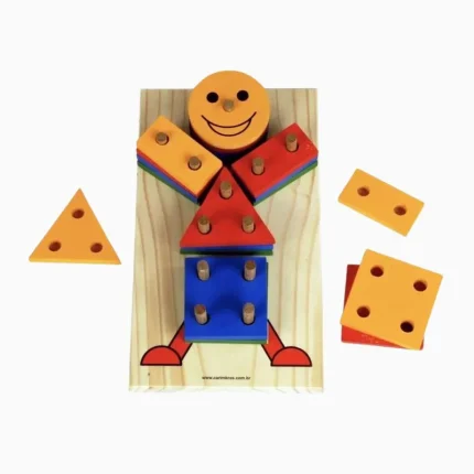 Colorido, cheio de formas e possibilidades, este conjunto convida as crianças a darem vida a um boneco montando e desmontando peças geométricas de madeira. Com retângulos, quadrados, triângulos e círculos, o desafio é encaixar tudo no lugar certo e, quem sabe, até reproduzir no papel e colorir. Cada encaixe se transforma em uma oportunidade de descoberta, trabalhando coordenação motora e o reconhecimento de cores e formas de maneira divertida.