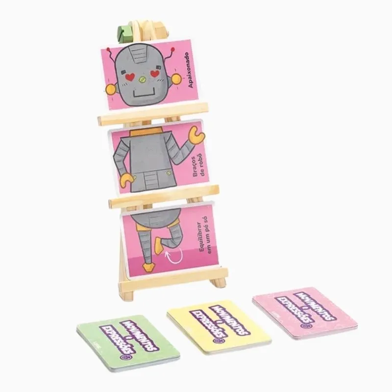 Três jogos, uma caixa só: movimentar o corpo, criar histórias e exercitar a memória nunca foi tão divertido! Com cartas coloridas e um cavalete de madeira, esse conjunto transforma qualquer momento em uma nova aventura. Ideal para brincadeiras em grupo ou em família, estimula expressão, imaginação e atenção de maneira leve e envolvente. Um convite irresistível para brincar, se movimentar e soltar a criatividade em cada partida!