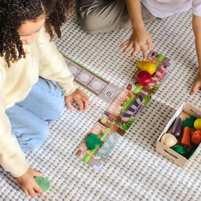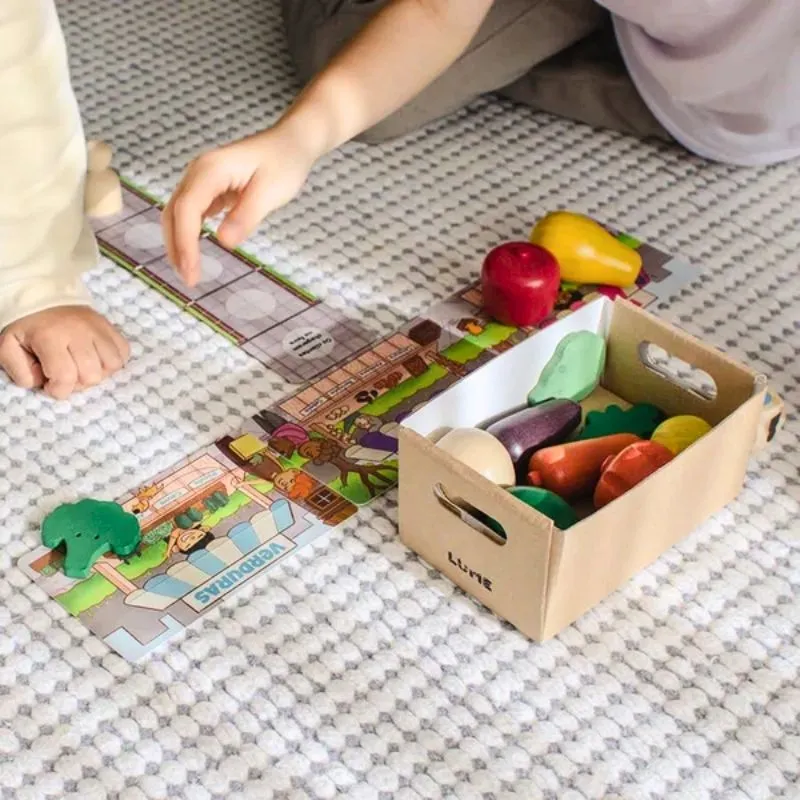 As possibilidades não acabam no jogo principal. A feira vira cenário para o faz de conta, com a criança podendo montar sua própria quitanda ou brincar de entregar os alimentos pelo bairro. As peças de madeira ganham vida nas mãos dos pequenos, dando espaço para a criatividade fluir naturalmente. São brincadeiras que se reinventam a cada sessão.