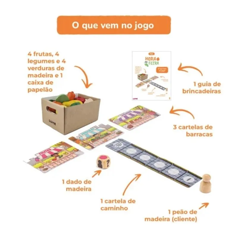 Uma feira cheia de sabores, cores e diversão! Com frutas, legumes e verduras de madeira, dado, peão e barracas ilustradas, o jogo convida os pequenos a montar uma feira antes da chegada dos clientes. Tudo acontece em equipe: um jogo colaborativo cheio de possibilidades. Perfeito para explorar o faz de conta, conversar sobre os alimentos e brincar com liberdade, estimulando a imaginação e o vínculo entre adultos e crianças.