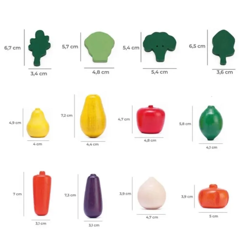 - Conteúdo da embalagem: 14 peças em madeira (1 caixa, 4 frutas, 4 legumes, 4 verduras, 1 dado e 1 peão), 5 peças em papel-cartão (1 caixa de feira, 3 cartelas de barracas, 1 cartela de caminho), 1 guia de brincadeiras