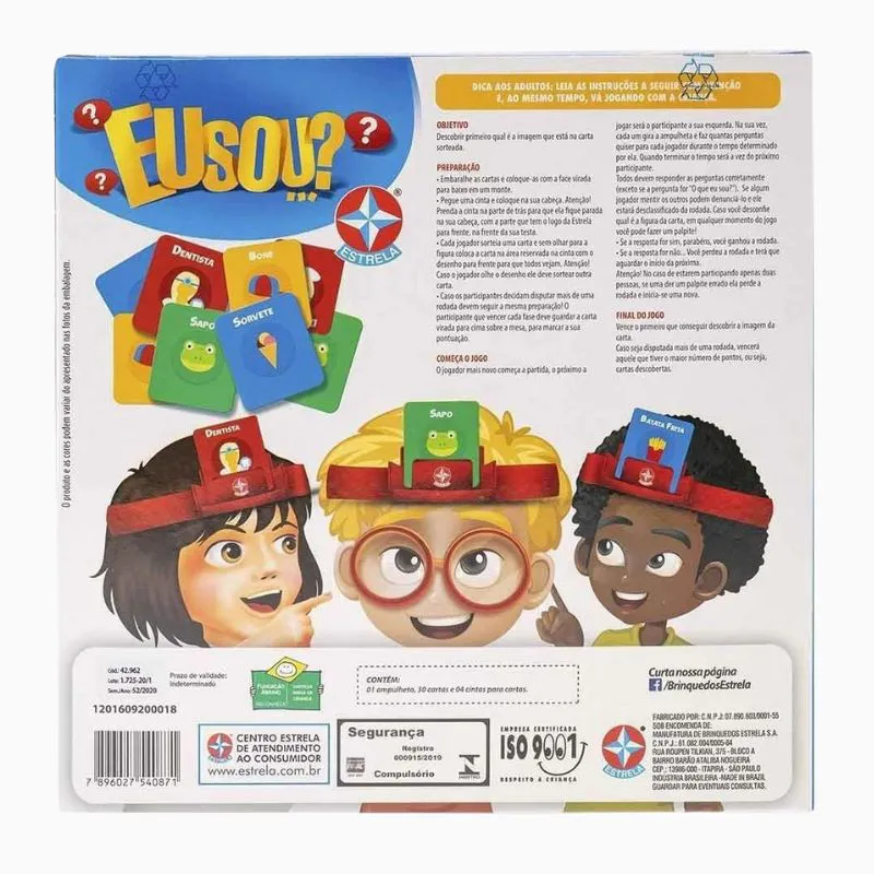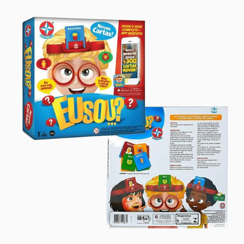 O Jogo De Tabuleiro Eu Sou? Estrela transforma perguntas simples em momentos de pura diversão. Com cintas na cabeça e cartas misteriosas, cada jogador precisa descobrir a imagem escondida apenas com perguntas como “Eu sou verde?” ou “Sou um animal?”. Essa dinâmica cativa adultos e crianças, tornando o jogo um excelente brinquedo educativo para estimular o raciocínio lógico e a comunicação.