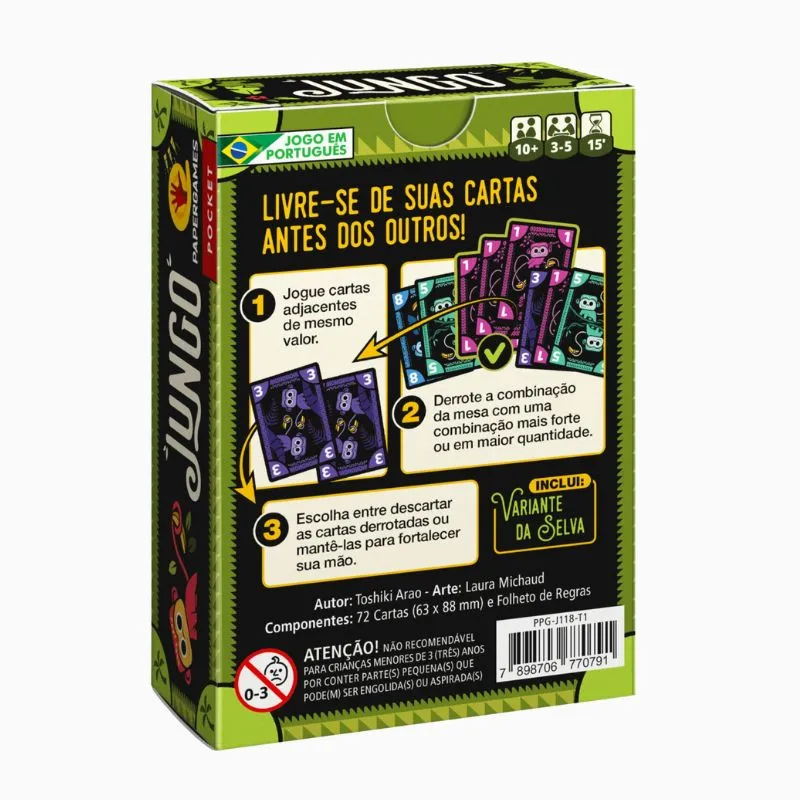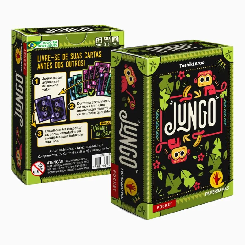 Parte da Linha Pocket, Jungo foi criado para acompanhar os momentos de lazer onde quer que você esteja. A caixa pequena cabe na mochila e o visual colorido chama a atenção desde a primeira partida. Com arte marcante de Laura Michaud e mecânica envolvente de Toshiki Arao, é daqueles jogos que animam qualquer encontro. Leve, acessível e sempre divertido.