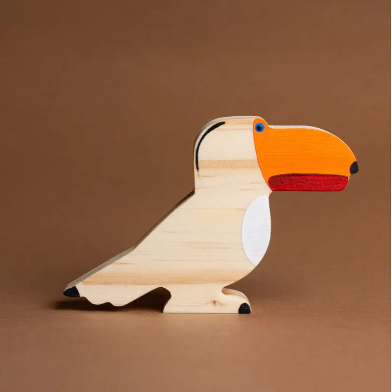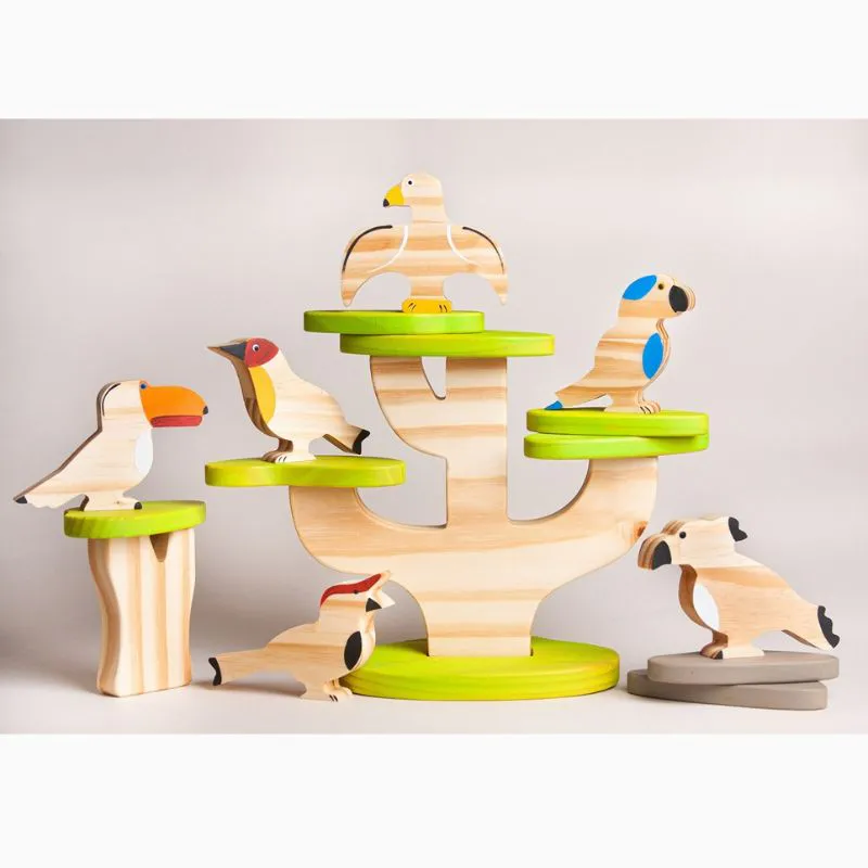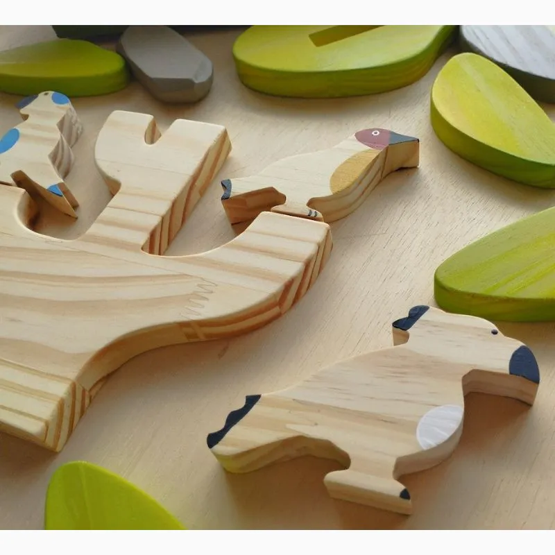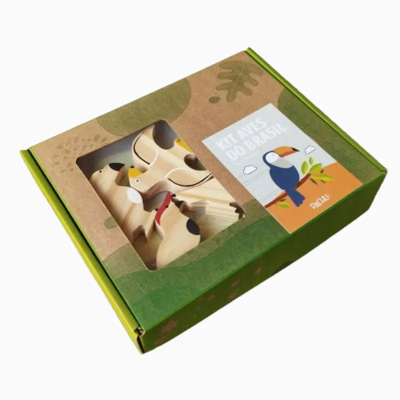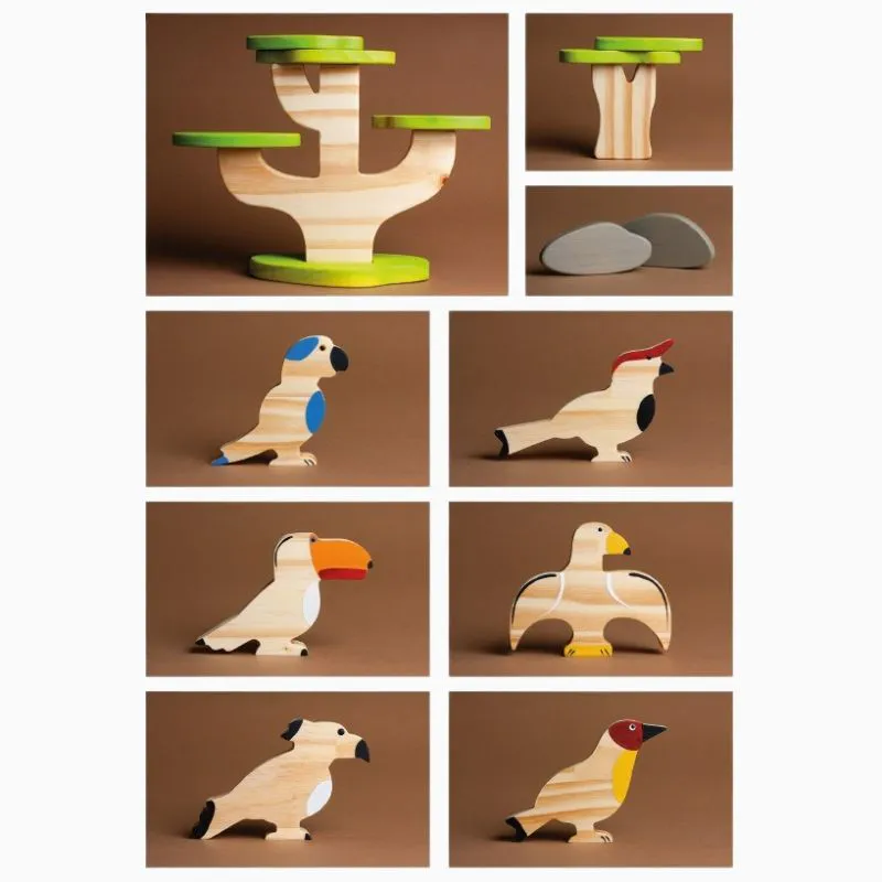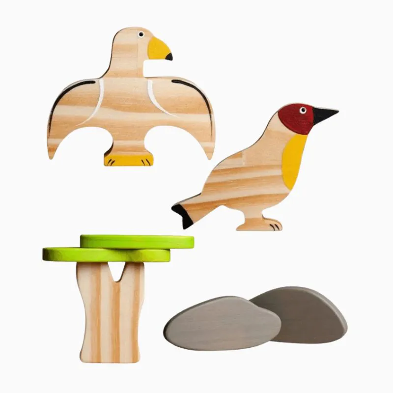 Feito com madeira de reflorestamento, acabamento com cera natural e tintas atóxicas, é seguro e durável. A embalagem em papel kraft com visor dá um toque especial para presentear. Acompanha encarte bilíngue com curiosidades sobre as aves. Um conjunto que une beleza, respeito à infância e carinho com o meio ambiente.