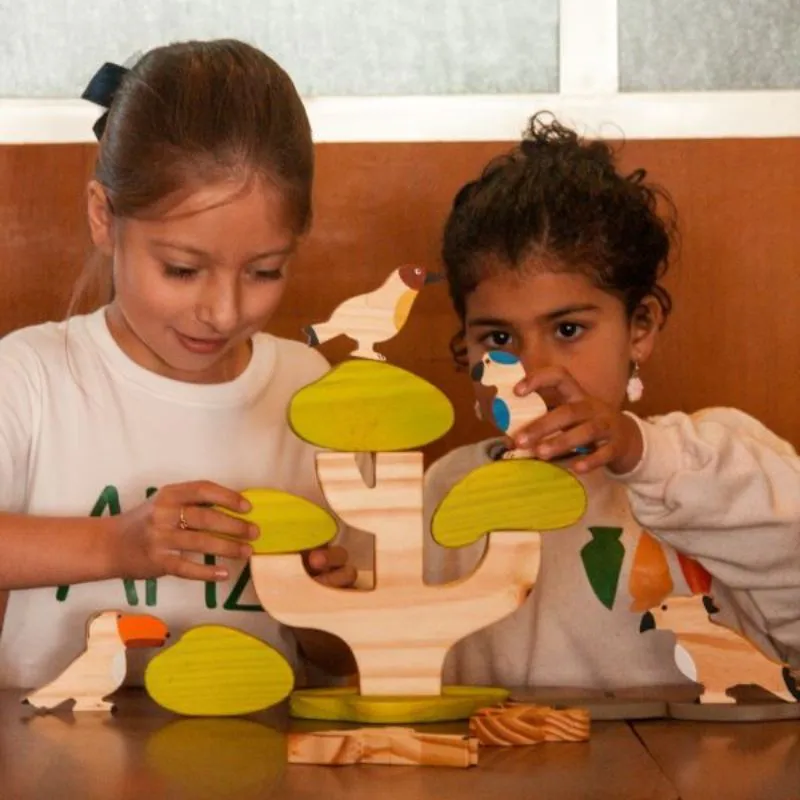 Uma floresta cheia de sons, formas e histórias espera pelas crianças neste encantador conjunto com animais brasileiros feitos de madeira maciça. Com 18 peças, o cenário pode ser montado e desmontado enquanto pequenos dedos exploram cores, texturas e possibilidades. Tucano, arara, uirapuru e outros personagens alados ganham vida em brincadeiras criativas, que também estimulam equilíbrio, desenho e até pintura. Um convite irresistível à imaginação e ao contato lúdico com a natureza.