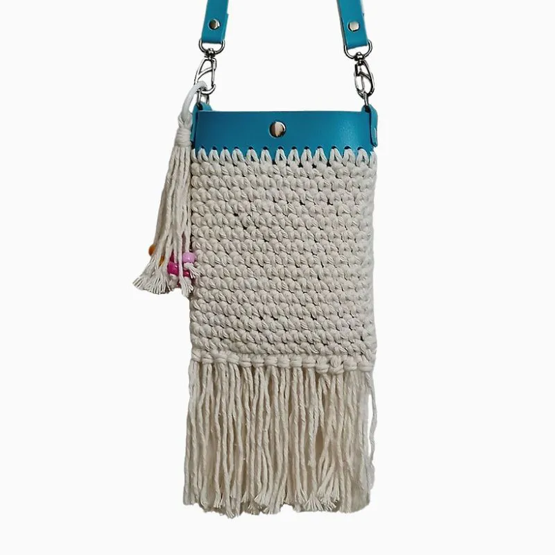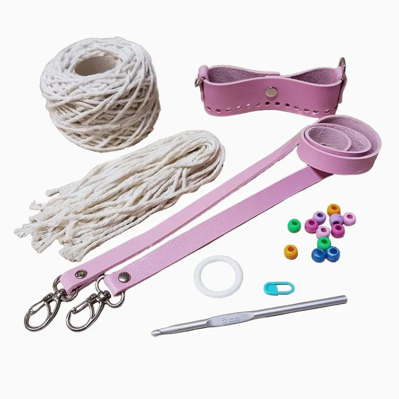 - Conteúdo da embalagem: 1 novelo de barbante cru, franjas de barbante, 1 agulha de crochê, 1 marcador de carreiras, 1 parte em couro sintético com botão de imã, 1 alça em couro sintético com mosquetões, argola e enfeite de plástico