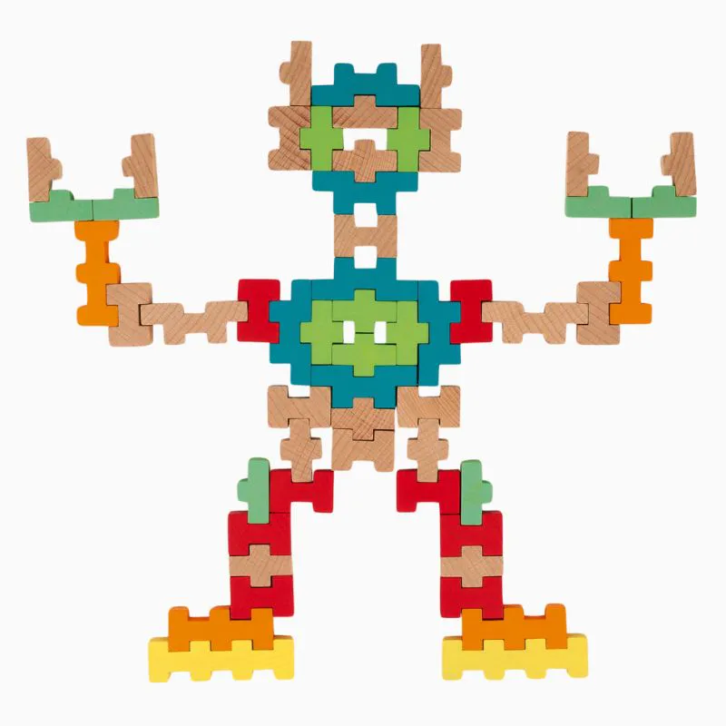 Com 100 peças de madeira maciça em cores vibrantes e diferentes formatos, este conjunto é um convite irresistível à criatividade. Ideal para montar aviões, robôs e até edifícios completos, basta encaixar e deixar a imaginação fluir. Acompanha modelos para inspirar novas formas de brincar em 2D ou 3D. Quando a brincadeira acaba, tudo volta para dentro do barril prático de armazenamento. Perfeito para pequenos inventores a partir dos 6 anos.