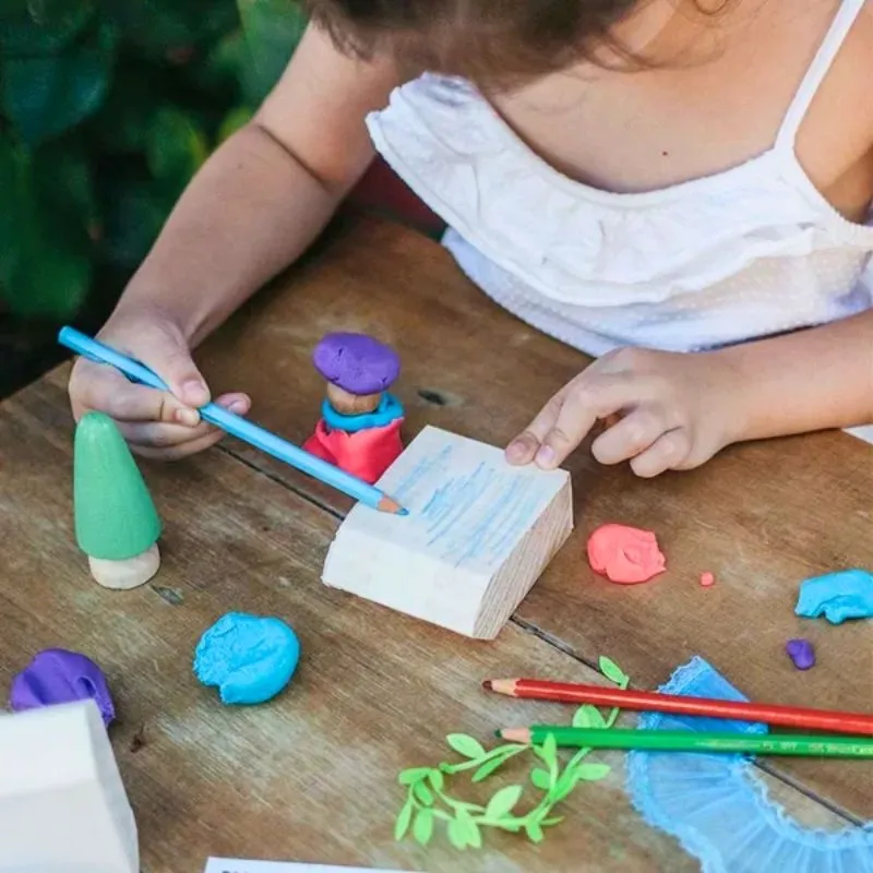 Cada peça pode ser customizada com lápis, tintas, tecidos ou massinhas. Isso amplia a criatividade e transforma o vilarejo em algo único. Não há certo ou errado — apenas liberdade para experimentar. A cada nova brincadeira, o conjunto ganha vida diferente, sempre com a identidade da criança.