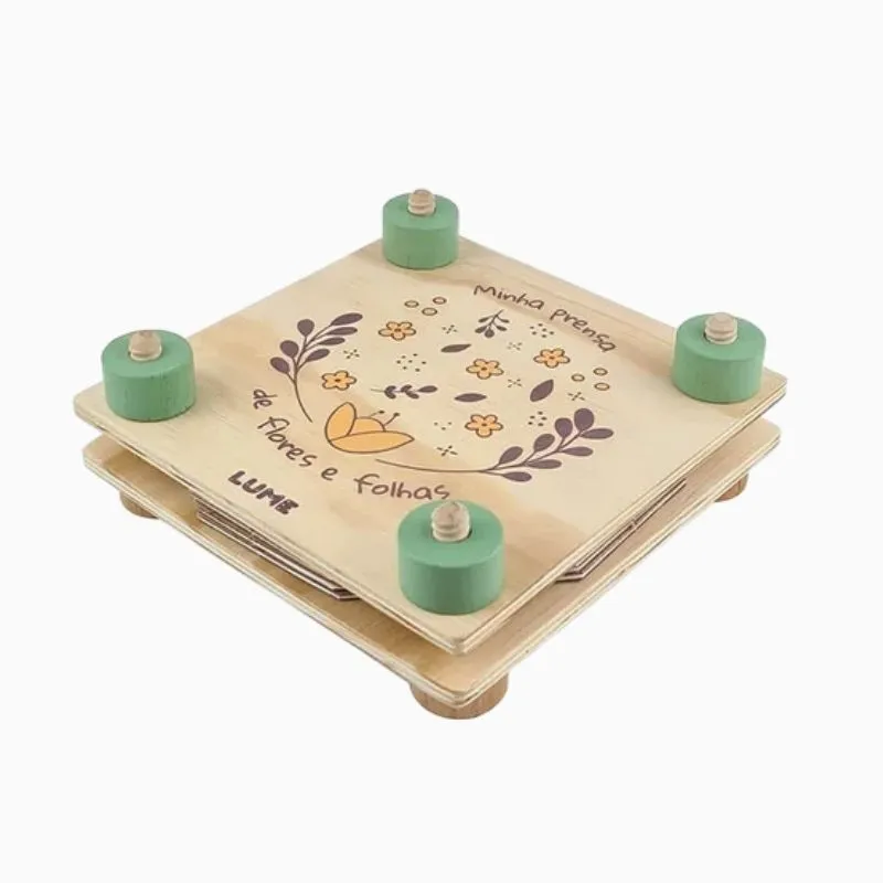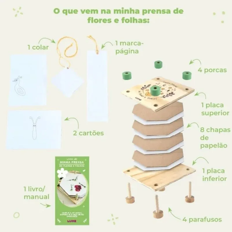 A Prensa de Flores e Folhas Lume é um brinquedo educativo que convida as crianças a se conectarem com a natureza de forma sensível e criativa. Coletar flores e folhas, prensá-las com cuidado e esperar o tempo da secagem é um exercício de paciência e observação. A transformação desses elementos em cartões, colares e pequenos arranjos torna tudo ainda mais encantador. Uma proposta que estimula o olhar atento e a imaginação desde os primeiros passos.