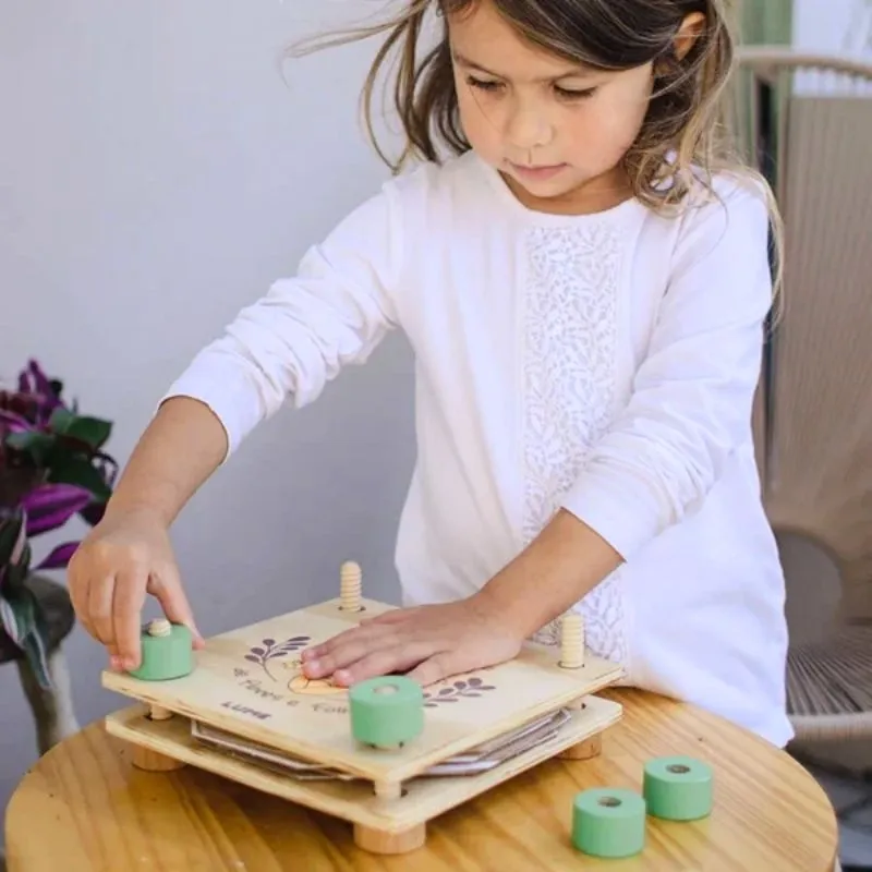 O kit acompanha tudo o que a criança precisa para iniciar sua jornada artística: porcas, parafusos, placas e um manual inspirador com sugestões de uso. Além disso, itens de papelaria como colar, cartões e marcador enriquecem ainda mais a brincadeira. A embalagem em formato de maleta facilita levar essa experiência para onde quiser. Um convite simples e afetuoso para criar com o que a natureza oferece.
