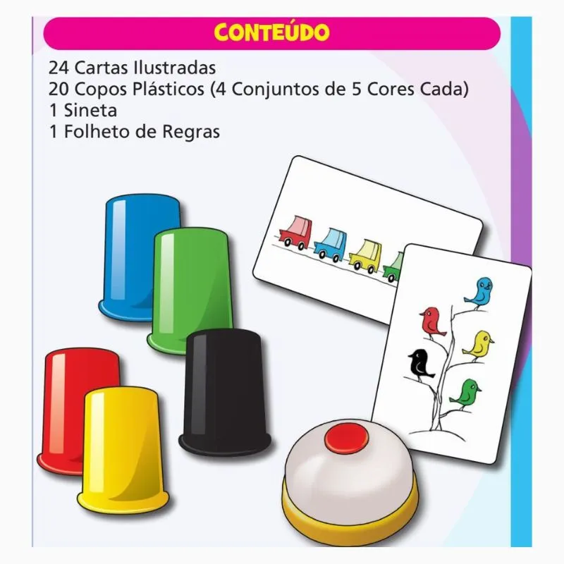 Colorido, rápido e cheio de emoção: neste jogo, cada participante recebe cinco copos de cores diferentes e precisa montar padrões com agilidade para vencer! As cartas trazem desafios visuais divertidos, e quem conseguir montar a sequência correta primeiro e tocar a sineta leva a rodada. Com partidas curtas e dinâmicas, é ideal para momentos em família ou entre amigos. Prepare-se para rir, competir e se surpreender a cada virada de carta!