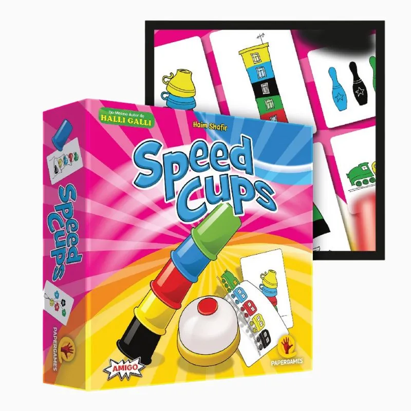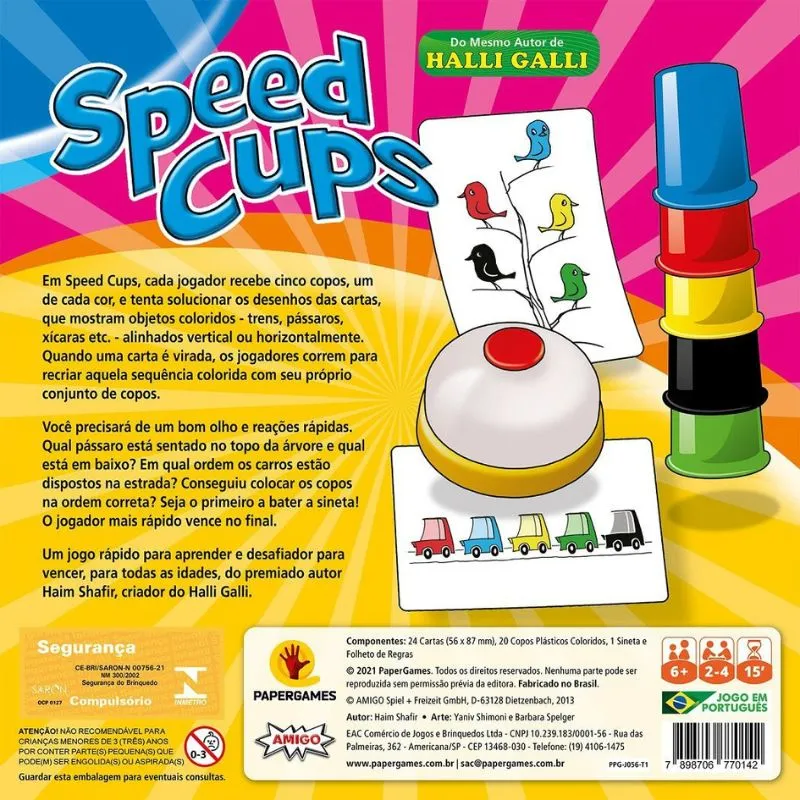 O Speed Cups Jogo de Cartas Papergames é pura agilidade e diversão. Cada jogador usa cinco copos coloridos para reproduzir o padrão das cartas o mais rápido possível. A sineta no centro da mesa marca quem acertou primeiro. Este brinquedo educativo traz estímulos importantes para o raciocínio visual, reflexos e concentração, mantendo crianças e adultos envolvidos do início ao fim.