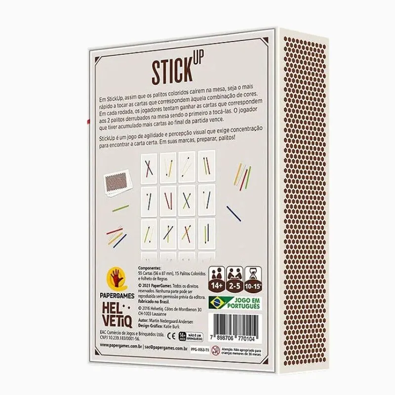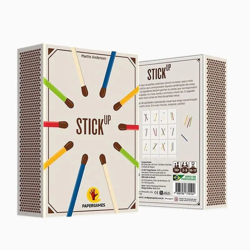 O StickUp Jogo De Tabuleiro Papergames é fácil de entender e instiga logo nas primeiras rodadas. Ao derrubar dois palitos coloridos na mesa, todos os jogadores tentam ser os primeiros a tocar a carta correspondente. Essa dinâmica simples mantém o ritmo rápido e envolvente do começo ao fim. Um excelente brinquedo educativo para exercitar percepção visual e reflexos com diversão.